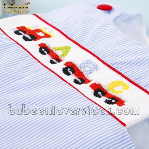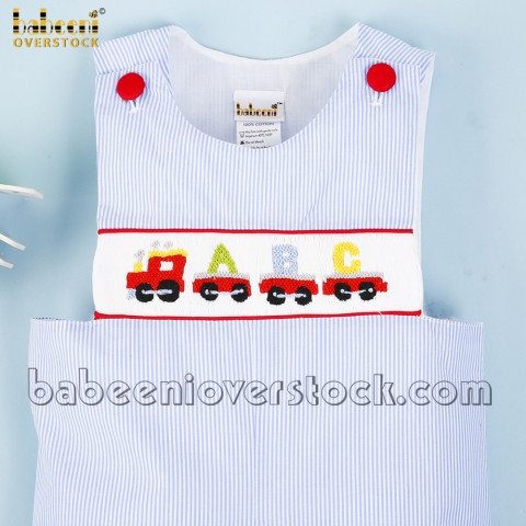 Feature:Cute baby boy romper with Alphabet train smocked pattern on the bodice, shoulder buttons, snap at crotch for easy dressing