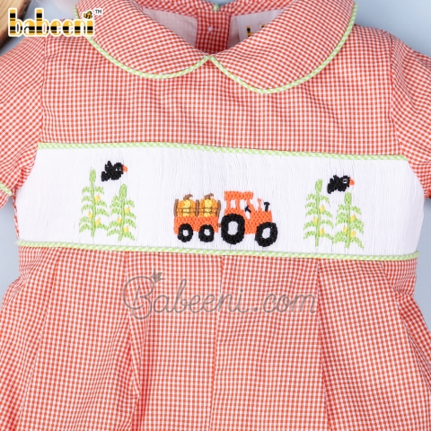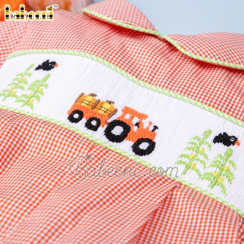 Features: Beautiful smocked bubble for little boys with hand smocked truck of pumpkin & trees on the chest, lime green hem. Perfect for Thanksgiving. Best gifts for birthday or special days.