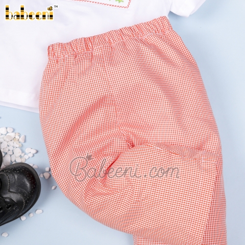 Features: Nice boy clothing for little boys with hand smocked truck of pumpkin & trees on the chest, orange gingham bottom. Perfect for Thanksgiving. Best gifts for birthday or special days.