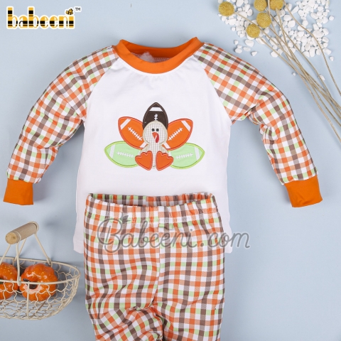 Feature: Nice loungewear for little boys with applique of turkey, orange cuff, fabric matching with pattern. Perfect for birthday or special days. Best gifts for birthday or special days.