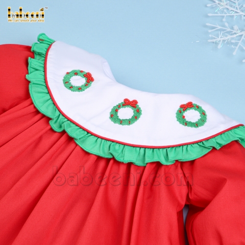Feature: Pretty dress for little girl on Christmas with wreath hand embroidery patterns on white neck, long sleeves, green ruffles.