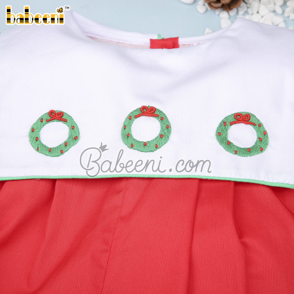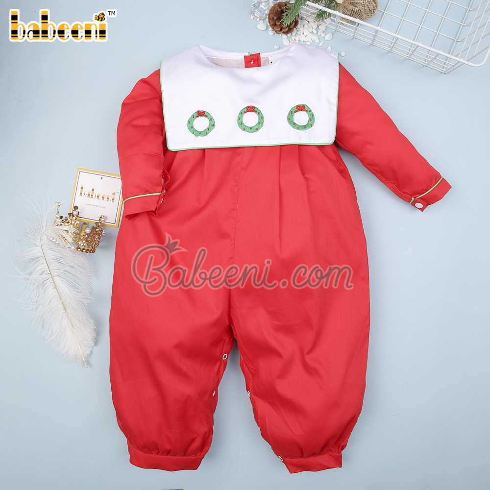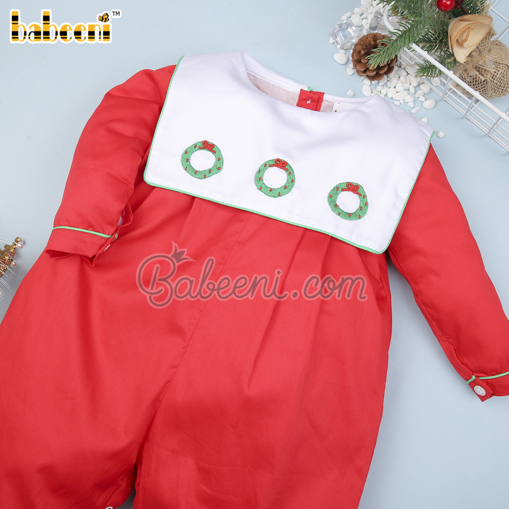 Feature: Nice long bubble for boys with wreath hand embroidery patterns on large white bib, long sleeves, crotch snap